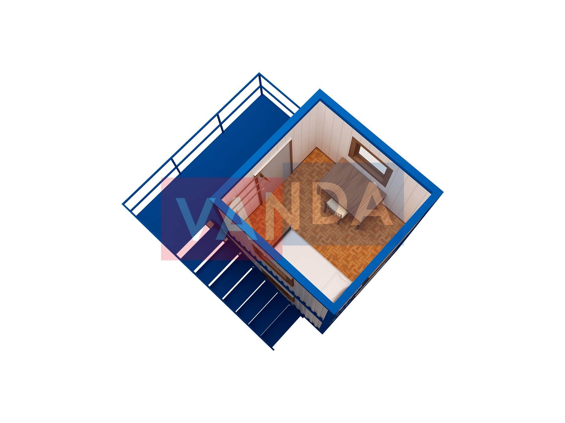 Пост охраны двухэтажный №3 (вариант 1) изготавливается из несущего каркаса (верхняя и нижняя обвязка): швеллер 100х50х3 мм., угловые стойки: сложно - гнутый угол 90х90х3 мм., крыша блок-контейнера: металл сварной 0,9-1 мм., качественная наружная отделка: оцинкованный профлист, вспомогательный деревянный каркас (стены) выполнен из брусок 40х75 мм., лаги пола: обрезная доска 40х100 мм., лаги потолка: обрезная доска 40х100 мм., выполнено утепление: Минеральная вата «ISOVER» – 50 мм. и пароизоляция: плёнка техническая, черновой пол состоит из: обрезная доска 20 мм. (2 сорт), чистовой пол покрыт: ДСП строительное 16 мм., отделка пола выполнена из качественных материалов. Контейнер комплектуется окнами: деревянное, двойное остекление 800х1000, входной дверью: ДГ 21-8 обшита снаружи оцинкованным листом, врезной замок и внутренними дверями. На второй этаж будки охраны ведет лестница с перилами, а площадка перед входом имеет ограждение. Если в БК присутствуют перегородки, то для них используется: брусок 40х50 мм.